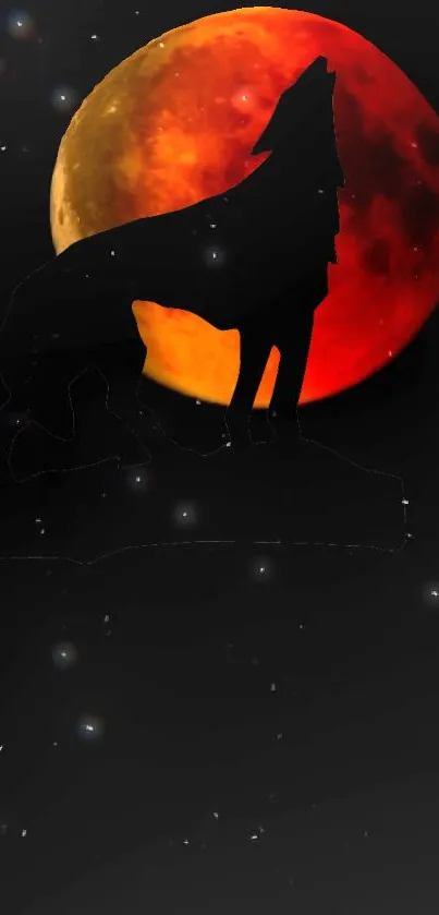 Stunning mobile wallpaper featuring a silhouetted wolf howling against a vivid red moon in a starlit night sky, creating a mystical and enchanting scene perfect for nature and astronomy enthusiasts