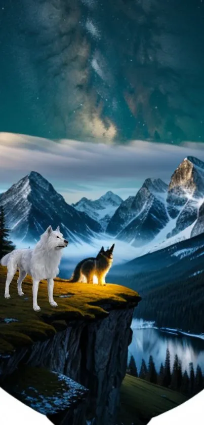 Discover serenity with this breathtaking mobile wallpaper featuring two wolves under a mesmerizing starry sky atop a majestic mountain, offering a tranquil and captivating landscape scene, perfect for nature and wildlife enthusiasts seeking stunning visual experiences