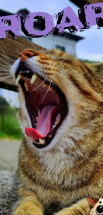 Cute mobile wallpaper featuring a yawning cat with bold ROAR text, ideal for feline lovers seeking a playful and vibrant screen background